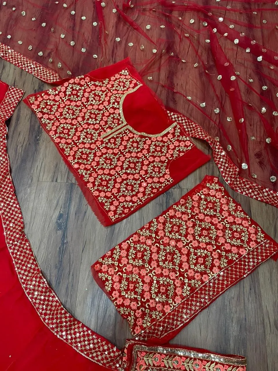 Fabric:-Gorgette Work :- Embroidece Stich :- 44 Unstich 🧵Lehengha *:- Fabric:- Georgette Inner :- crep work :- embroidery with Sequnce ( *cancan and canvas) Flair. :- 3.80 meter😍😍😍 Stich :- Upto 44Semistich 🧶Dupata Fabric :- Net work :-embroidery with Sequance four Lace broder And both Dupata 2.5 meter both Dupata ry with Sequn