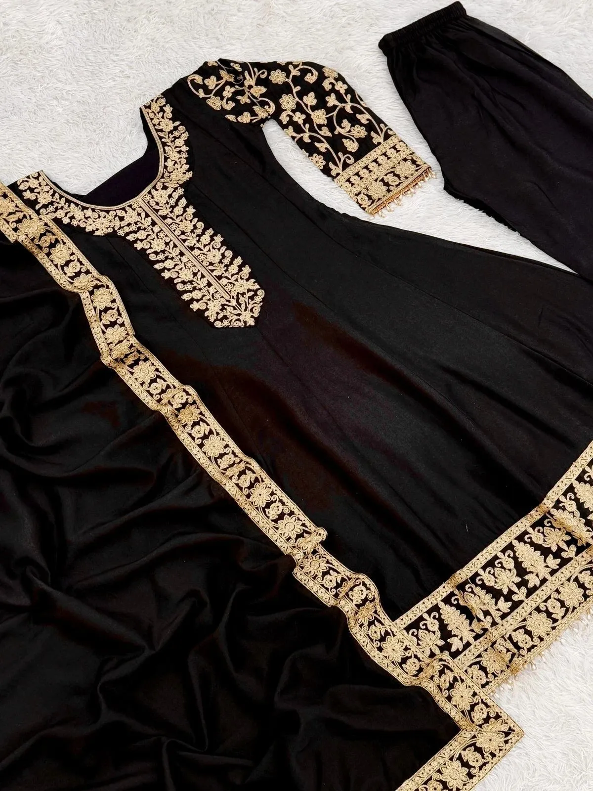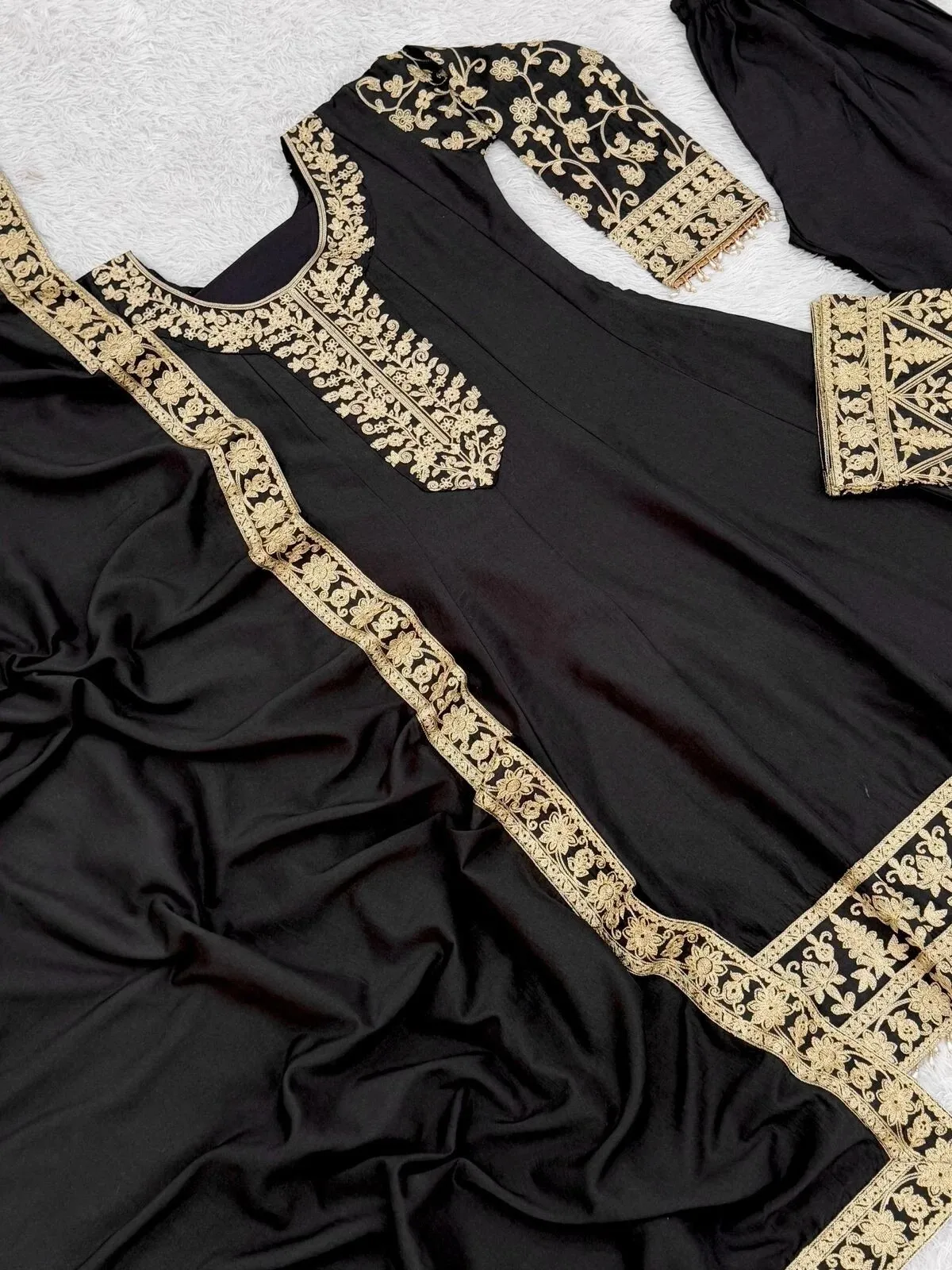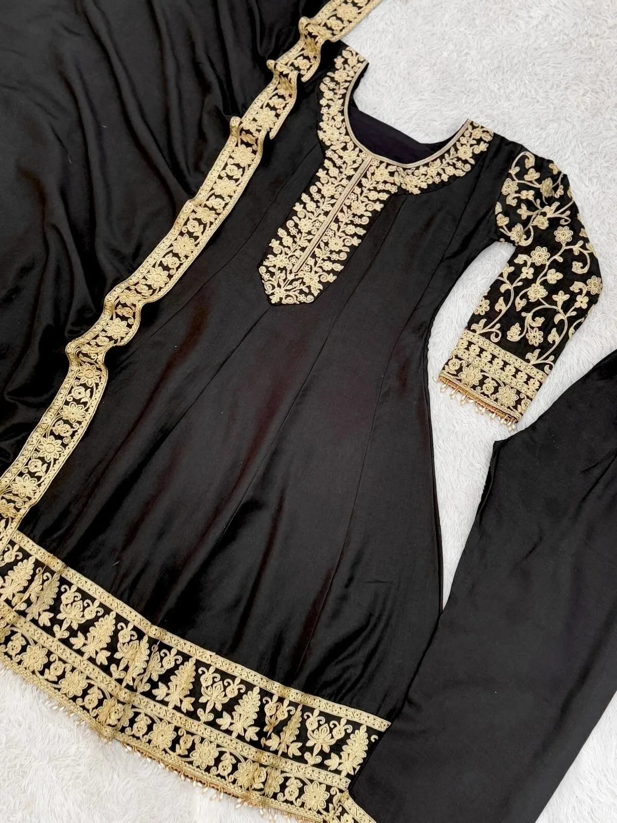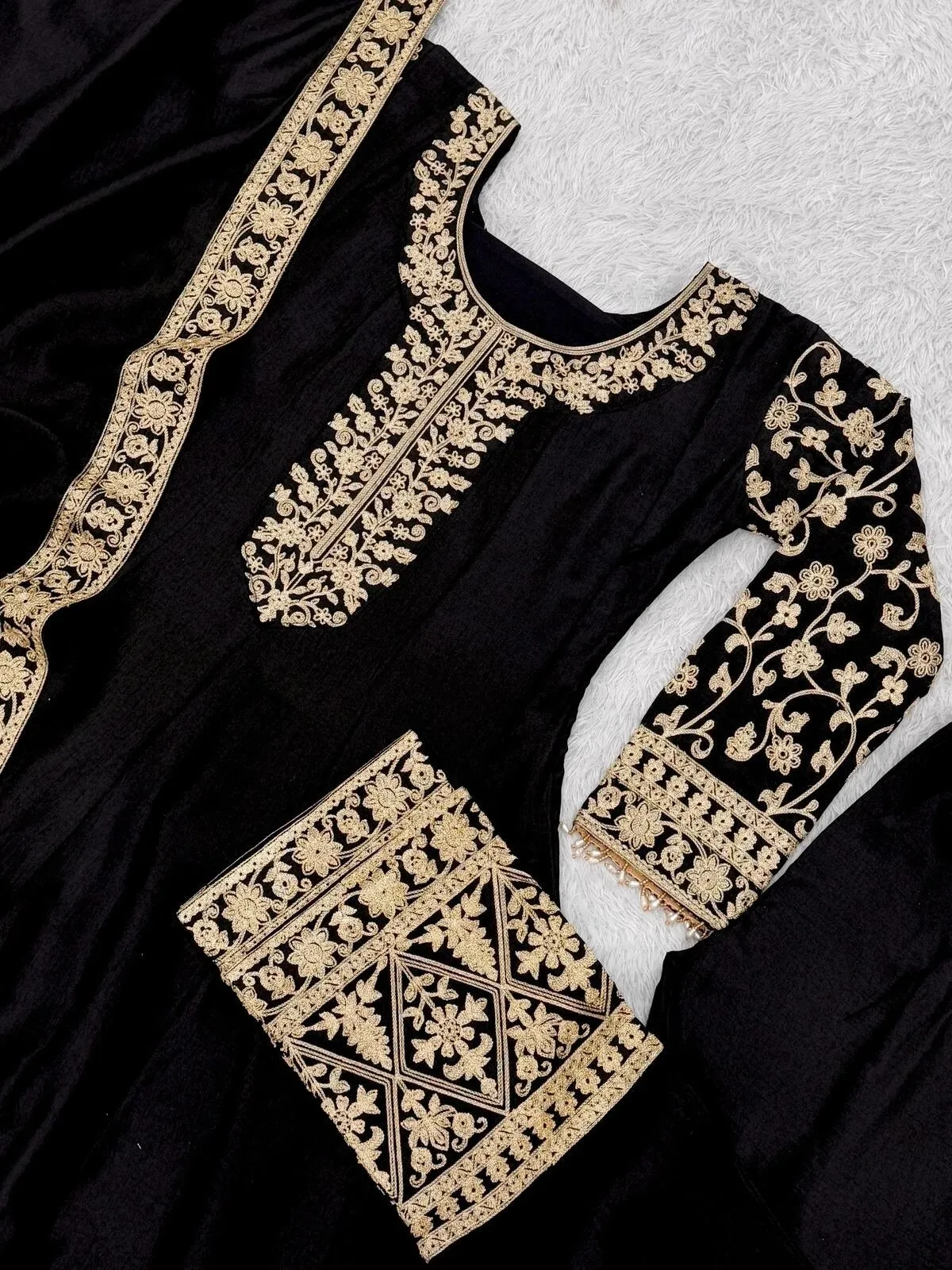 This party salwar kameez is a stunning Pakistani Bollywood style wedding dress made from luxurious silk material. The black color and intricate design give it a glamorous and elegant look, perfect for special occasions. Handmade in India, this designer gown is tailored for women who appreciate traditional and refined clothing with a touch of modern flair. It is a beautiful representation of Indian and Pakistani culture and craftsmanship.