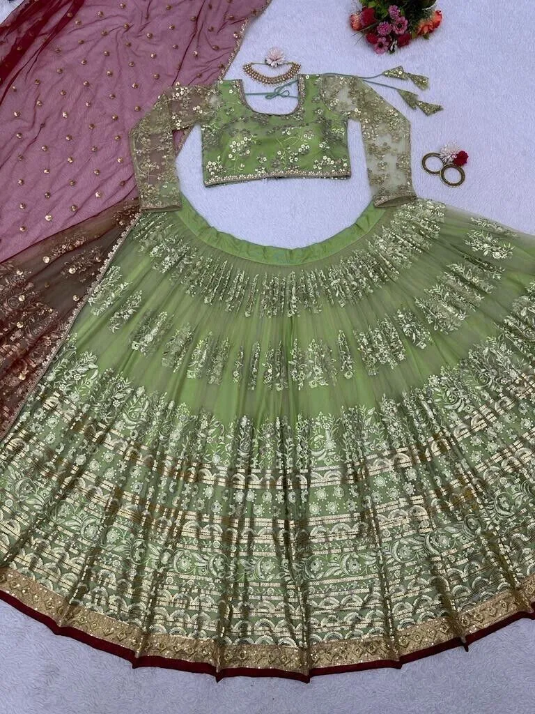 Fabric : Net Work. : 3 mm seqce Size : Up to 44" Length : 42" Inner. : Crep Lehengha Type : Semi-Stitch Flair. : 3.0MTR *canvas patta & Cancan)💕💕 👘Choli Fabric : Net Work. : 3 mm seqce Size : 1.0 meter (unhitch) 🧣Dupatta Fabric : Net Work. : 3mm seqce Size
