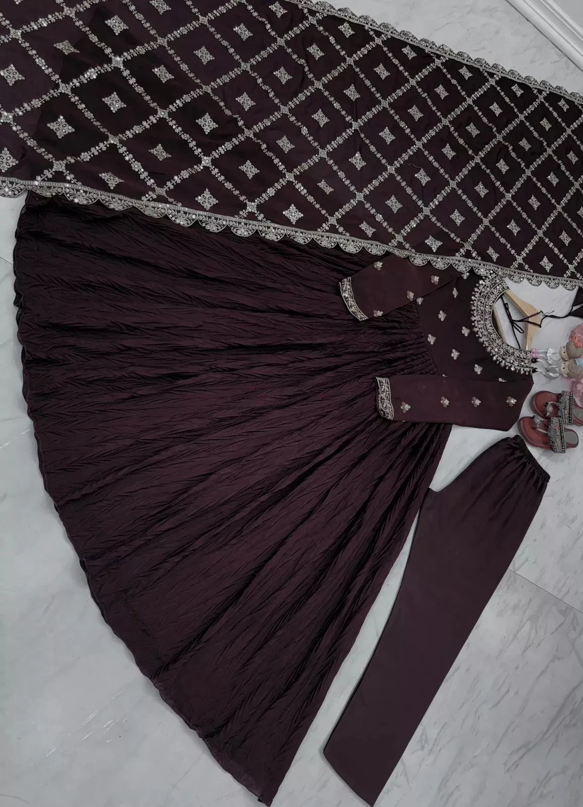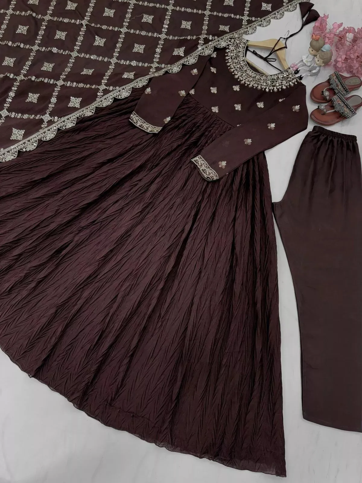 This party salwar kameez is a handmade Pakistani designer dress made of silk in a brown color. It is designed specifically for women and is a traditional outfit from India. This elegant gown captures the essence of Indian and Pakistani wedding attire, making it a perfect choice for special occasions. Made with high-quality materials and attention to detail, this outfit exudes a sense of style and sophistication typical of Bollywood-inspired designs. Perfect for those looking for a unique and culturally influenced fashion statement