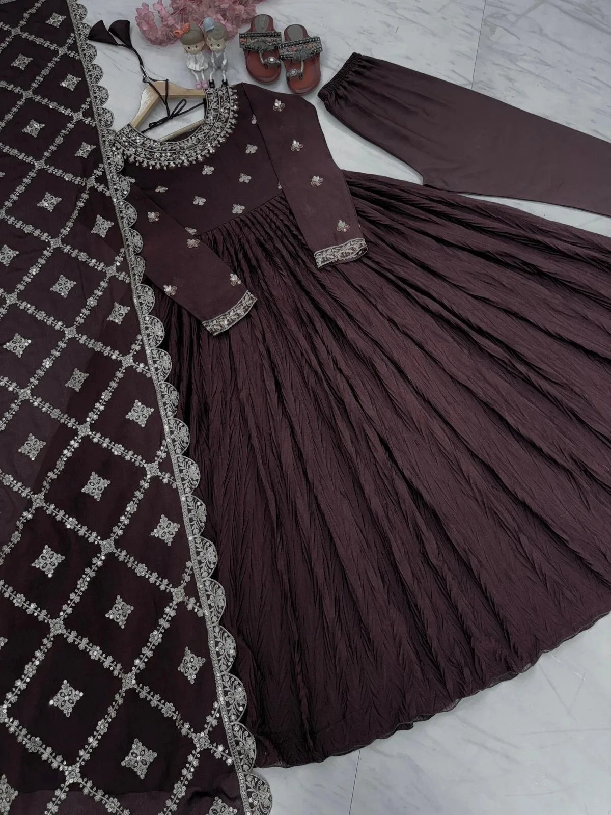 Gown Fabric :Pur Crush Chinon Silk With Embroidery 5 mm Sequence Work With Sleeve With Tassels